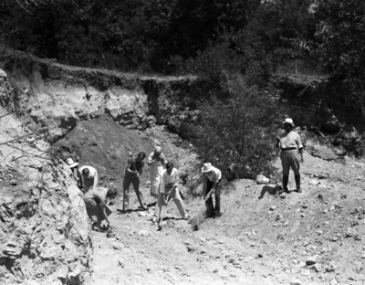 Gold found on a farm near Springtown, Texas, on property of Mr. and Mrs. Brice E. Griggs; group of people, including Mr. and Mrs. Griggs and Fred Jacobs, dig for the ore on the property, 08/10/1936