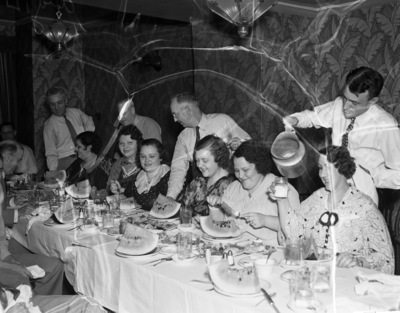 Six Tiny Rosebuds, who perform at Fort Worth's Frontier Centennial, dine at the Blackstone Hotel as guests of Retail Credit Men's Association, 08/12/1936 [see envelope for names]