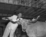 Paul Whiteman measuring horns on a mounted steer in the West Texas Chamber of Commerce building at the Frontier Centennial, 08/26/1936