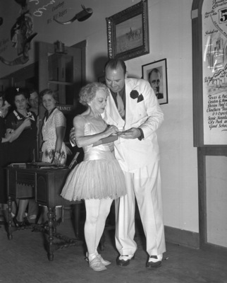 Paul Whiteman with Josie DeMotte Robinson, aged bareback rider of Jumbo the elephant, autographing book, 08/26/1936