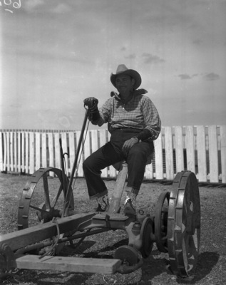 Paul Whiteman at a farm sitting on a tractor, 09/04/1936
