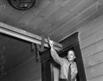 Harry Gould, manager of Palace Theater, points to electric light that has burned for 28 years and continues to burn.