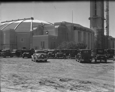 Fort Worth Frontier Centennial, Will Rogers Coliseum and Tower under construction, cars parked beside building site, 09/29/1936