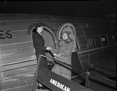 Arrival of American Airlines sleeper planes on inaugural runs. Mrs. T. H. Wilhelm of Fort Worth and Oakland, California boarding plane. Thelma Weld, stewardess, greeting her.