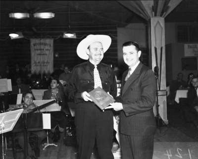Texas Governor James V. Allred presents Paul Whiteman with Radio Stars' Distinguished Service Award during broadcast from Ringside Club, radio show, 10/11/1936