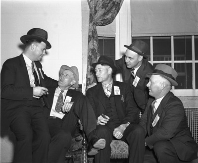 World War I 90th Division members swap war tales at Hotel Texas; left to right, Willard H. Strickland (Omaha); Guy L. Cavallin (Fort Lavaca); W.A. Beach (Scotland, Ark.); R.E. Singleton (Wood River, Ill); and J. Earl Johnson (Pawnee, Okla.), 11/06/1936