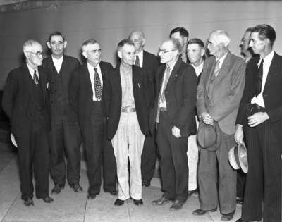Erath County men who won suit in Federal Court to recover property given by J.D. Howth grandfather by the Republic of Texas; left to right, Alexander, Burns, Hallmark, McCleskey, Carson, Sones, and Burns; in rear, Jennings, Harbin, White, and Cline, 11/18/1936