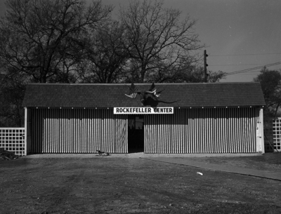 Shady Oak Farm decorated for a visit of Winthrop and Nelson Aldrich Rockefeller. This photograph shows the exterior of the bar at Shady Oak Farm, which has been modified to include a sign that reads "Rockefeller Center." There is a taxidermied longhorn head attached to the front of the building above the sign, with an American flag to the left and a Texas flag to the right.