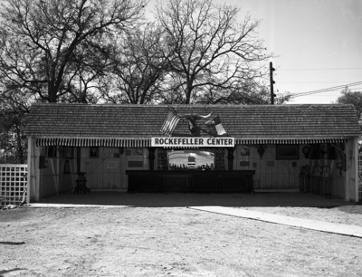 Shady Oak Farm decorated for a visit of Winthrop and Nelson Aldrich Rockefeller. This photograph shows the exterior of the bar at Shady Oak Farm, which has been modified to include a sign that reads "Rockefeller Center." There is a taxidermied longhorn head attached to the front of the building above the sign, with an American flag to the left and a Texas flag to the right.