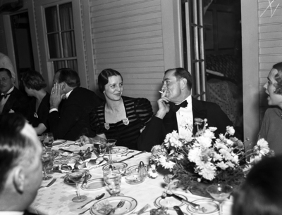 Photograph taken at a party for Nelson and Winthrop Rockefeller at Shady Oak Farm. Several unidentified people are seated at a table laid with food and drink.