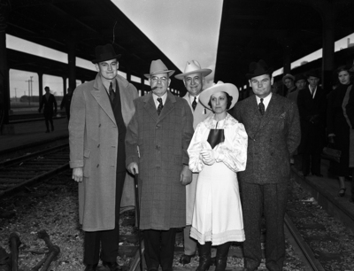 Some Horned Frog fans who crowded onto the observation platform of the Star-Telegram's 12-car special train as it pulled out of the Texas and Pacific Station Tuesday morning, bound for San Francisco and another Texas Christian University (TCU) - Santa Clara football game. Amon G. Carter, Sr. (center) and several unidentified people. The woman on the right is Bess Coughlin.