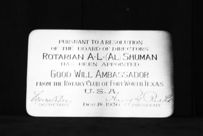 Plaque presented to A. L. Shuman by Rotary Club which appoints him Good Will Ambassador on his voyage around the world, 12/19/1936