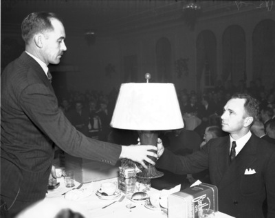 H.C. Dillard of Portland, Oregon, receiving one of gifts distributed from H.D. Chandler, left, at Salesmen's Banquet, 12/30/1936