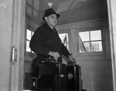 Harry Purser, one of the caretakers of the Fort Worth Frontier Centennial buildings, stands at the controls of the 130-foot revolving stage of Casa Manana, 12/30/1936