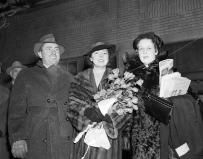 Colleen Moore, silent film star, with W.C. Stripling Junior (left) and unidentified woman (right, Mrs. Amon Carter?) at Fort Worth's Texas and Pacific Railway Station, 01/09/1937