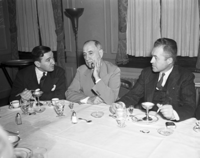 Dinner at the Fort Worth Club for advertising executives; from left, Bernard Musnik (of Paris), Amon Carter, and Ralph S. Bishop, 01/12/1937