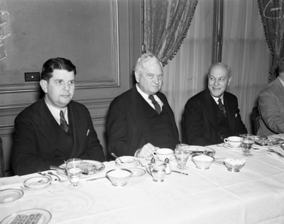 Chamber of Commerce luncheon at the Fort Worth Club honoring officials who helped lay the cornerstone at the U.S. Narcotic Farm; from left, Daniel E. McGrath, W.A. Thomas, and Congressman Lanham.