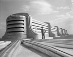 Climate system atop the newly built Will Rogers Memorial Coliseum; man not identified, 03/03/1937