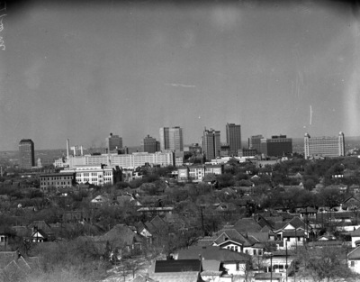 Skyline of Fort Worth, looking north over rooftops of neighborhoods south of downtown, 03/10/1937