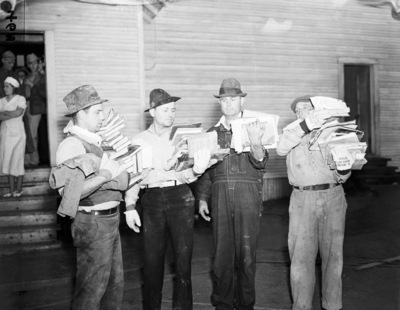 Relief workers carry books not destroyed by the explosion from New London School, 03/18/1937