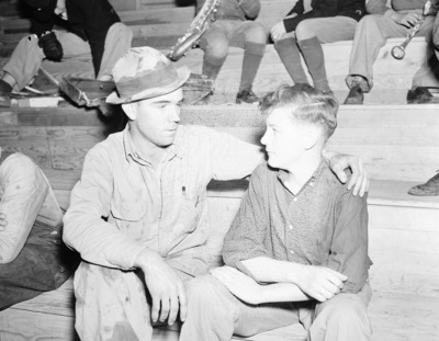 Relief worker consoling boy after New London School explosion, 03/18/1937