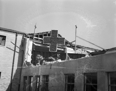 Huge memorial cross of red carnations hangs on portion of the wrecked New London School one week following explosion, 03/28/1937