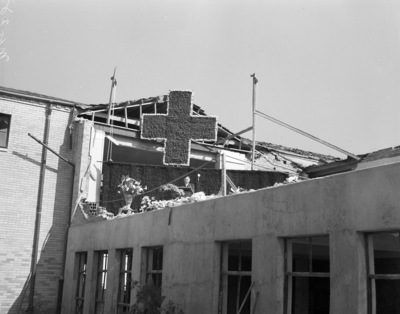 Huge memorial cross of red carnations hangs on portion of the wrecked New London School one week following explosion, 03/28/1937