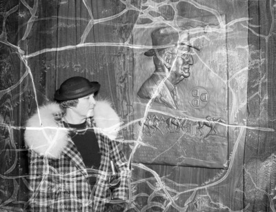 Mrs. E. Paul Waggoner stands beside plaque of W. T. Waggoner that hangs in the Texas Jockey Club at Arlington Downs, 04/03/1937