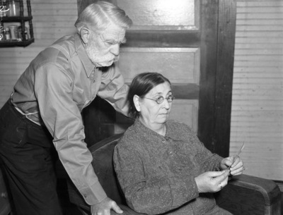 Mr. and Mrs. W.G. Miller of Burleson with letter received from their son whom they believed they had buried after being killed in automobile accident in California, 04/06/1937