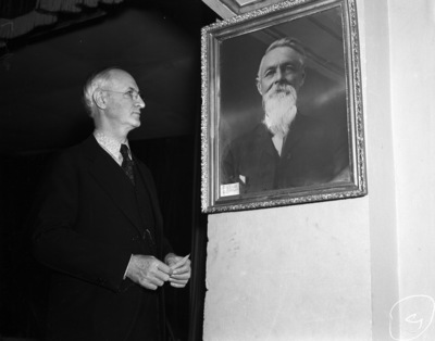Texas Christian University (T. C. U.) Dean Colby D. Hall with portrait of Randolph Clark who was a co-founder of Add-Ran College, precursor school to Texas Christian University, 04/07/1937