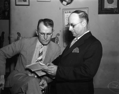 Carl E. Jeffries of Dallas (right) shows canal literature to C.C. Hayley; Retail Gasoline Dealers Association meeting in Fort Worth, 04/07/1937