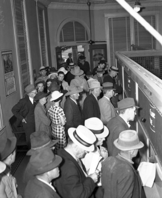 Depression-era run on the bank; a crowd waits to withdraw their money from the First State Bank of Arlington, 05/03/1937
