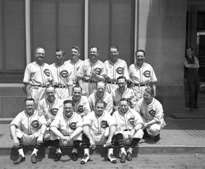 Shrine ticket sales committee with Shriners in Cats uniforms for Cats and Oilers baseball game, 05/07/1937