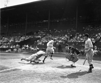 Baseball action in game between Fort Worth Cats and the Tulsa Oilers, Oilers' Max Thomas runs for home, but is tagged out by Cats' Manuel Onis 05/09/1937