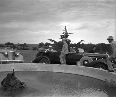 Franklin D. Roosevelt in car near fountain at Shady Oak farm with Amon G. Carter and others, 05/12/1937