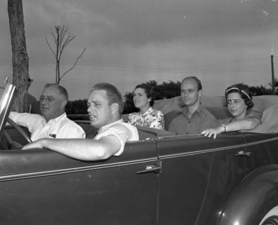 In the car near Benbrook, driving is Elliott Roosevelt, with his father, President Franklin Roosevelt in front seat. Rear seat, Mrs. Elliott Roosevelt, another son James Roosevelt, and Mrs. Eloise Wells Polk of St. Louis, 05/12/1937