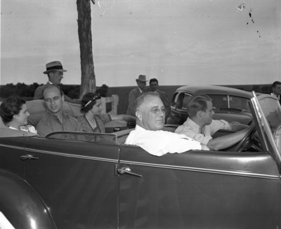 In the car near Benbrook, driving is Elliott Roosevelt, with his father, President Franklin Roosevelt in front seat. Rear seat, Mrs. Elliott Roosevelt, another son James Roosevelt, and Mrs. Eloise Wells Polk of St. Louis, 05/12/1937