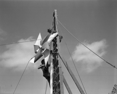 Workmen putting up pinwheel on the Pinwheel Boulevard, Fort Worth's Frontier Fiesta, 05/21/1937