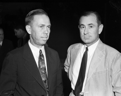 University of Texas Ex-Students Association meeting; former gridsters M.L. Massingill (left, former halfback in 1911)) and R. K. Hanger (quarterback in 1916), 05/24/1937