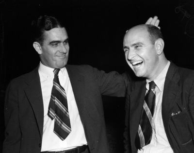 University of Texas Ex-Students Association meeting; Jack Harris, of 1923 class, pats bald head of Joe Terrell of 1927 class and former president of the Exes, 05/24/1937