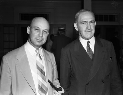 University of Texas Ex-Students Association meeting; Dana X. Bible (left), head head coach at University of Texas (Austin), greets Mark McMahon who played with Longhorns from 1897 to 1901 and coached at Oklahoma from 1902-1904, 05/24/1937