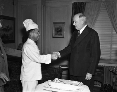 Fort Worth visit by Postmaster General James A. Farley; Farley shakes hands with Fort Worth Club chef J. E. Wurth who baked his birthday cake, 05/30/1937