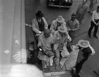 Fort Worth visit by Postmaster General James A. Farley; Farley joins Amon Carter, Elliot Roosevelt and others in a 1902 Cadillac for trip from Texas and Pacific station to the Fort Worth Club, 05/30/1937.