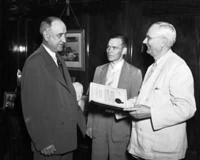 Left to right, Amon G. Carter, Hays Bacus, and president E. M. Waits of Texas Christian University (T. C. U.), with yearbook dedicated to Amon Carter, 06/02/1937