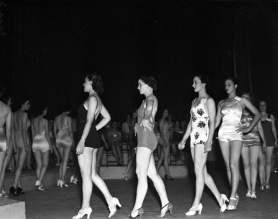 Frontier Fiesta Sweetheart contest; entrants parading across stage in bathing suits, 06/05/1937
