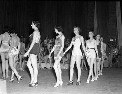 Frontier Fiesta Sweetheart contest; entrants parading across stage in bathing suits, 06/05/1937