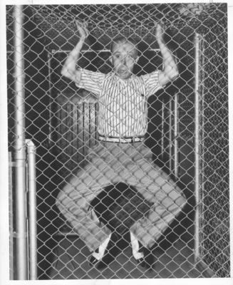 Pat Rooney Sr. doing monkey act in menagerie of the Jumbo building at Fort Worth Frontier Centennial, 06/25/1937
