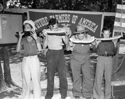 Future Farmers camped at Lake Worth enjoy watermelon; from left, Joe Roper, Jack Meador, Houston Clark, and Daniel Wicker, 07/15/1937