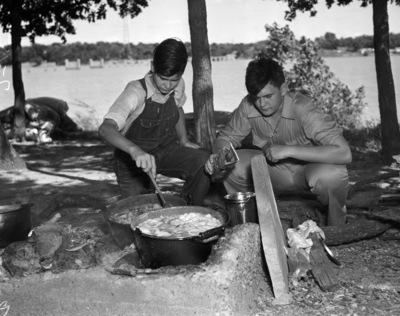 Future Farmers of America camped at Lake Worth; from left, J. C. Rhodes of Trumbull and Jack Stewart of Lewisville cook beans and coffee over a campfire, 07/15/1937