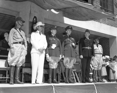 Health Festival, Mineral Wells, Texas; Paul Whiteman, Governor James V. Allred, and others on parade viewing stage, 07/17/1937